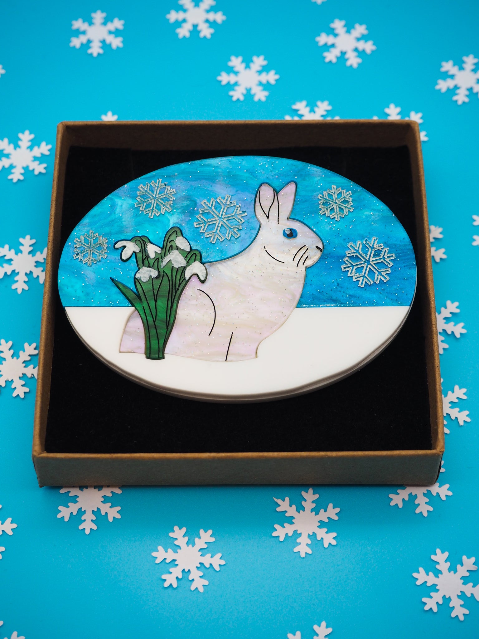 Beside the rabbit blooms a cluster of delicate snowdrops, their petals crisp and bright against their stems of deep marble green acrylic. This touch of early spring adds a hopeful note to the wintry scene, bringing depth, colour, and a gentle reminder of nature’s resilience.