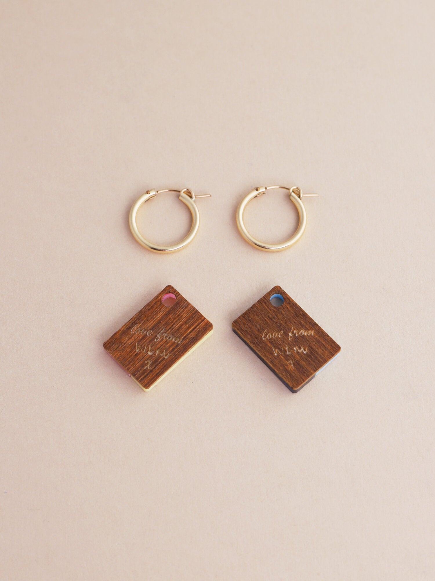 Acrylic, FSC approved wood, 14k gold-filled hoops.