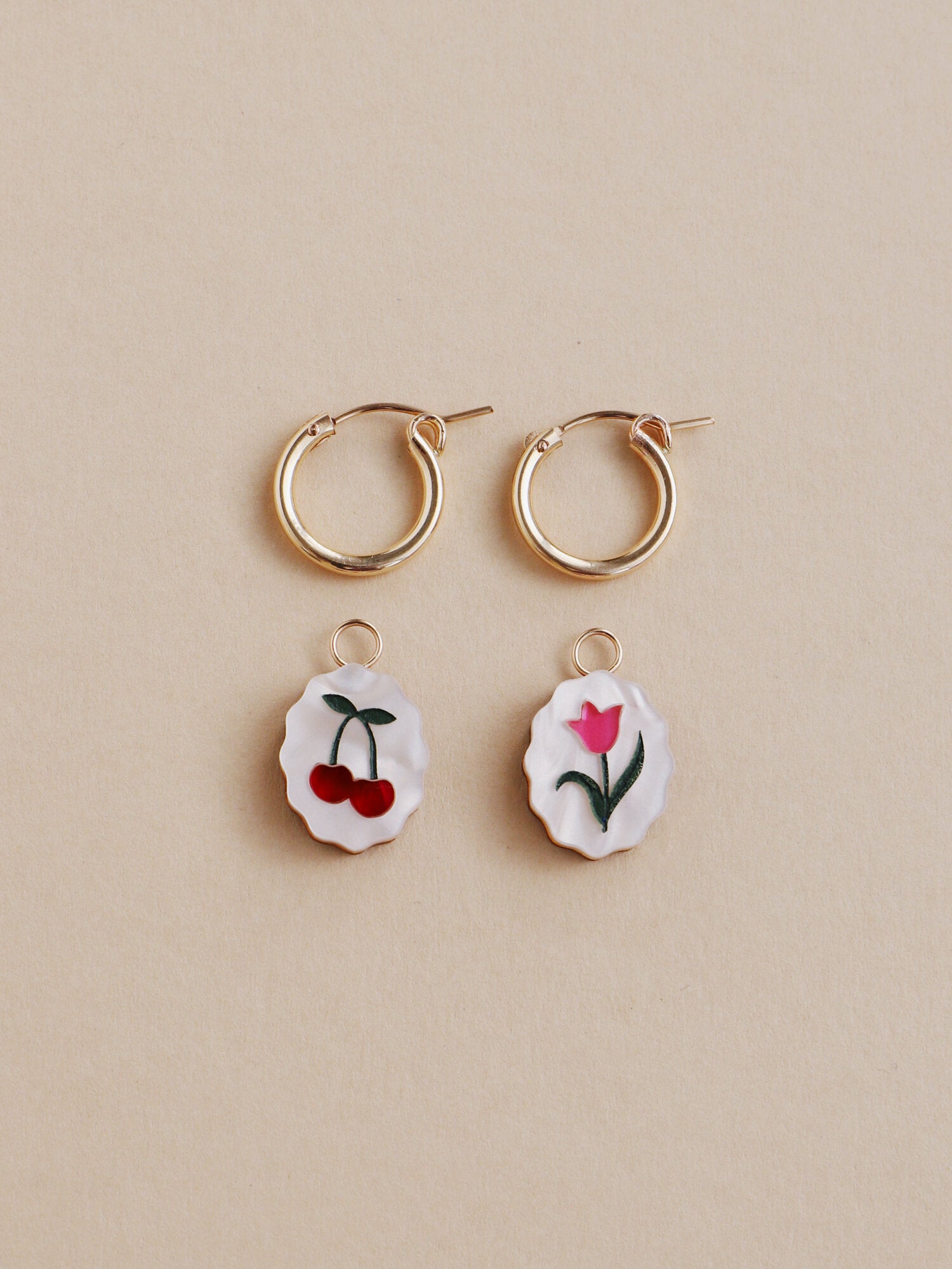 The perfect everyday essential, our tulip & cherry charm hoop earrings are lightweight and easy to wear. Inspired by vintage fruit stickers and English and Dutch delft tiles.